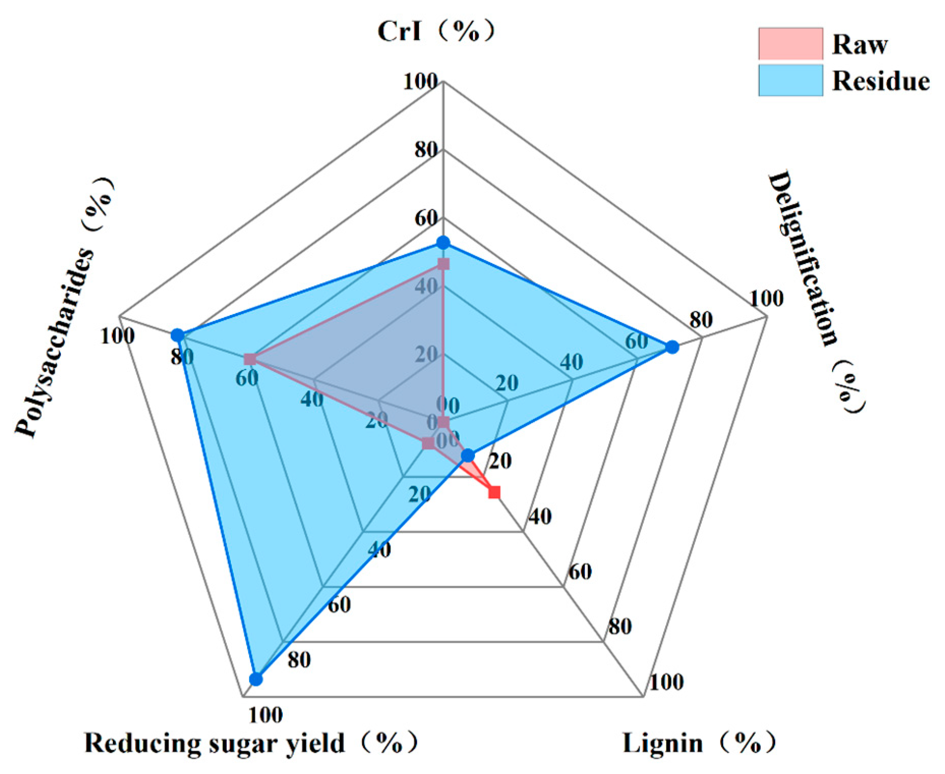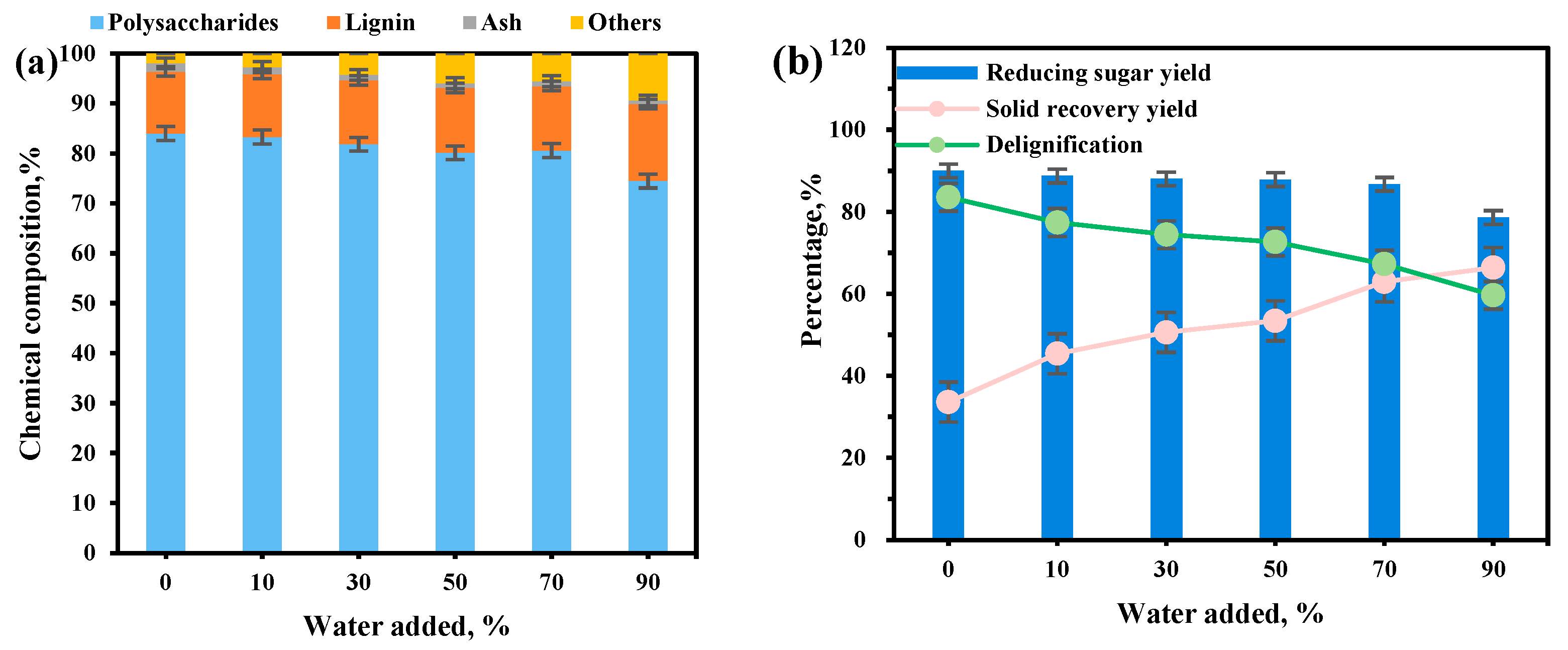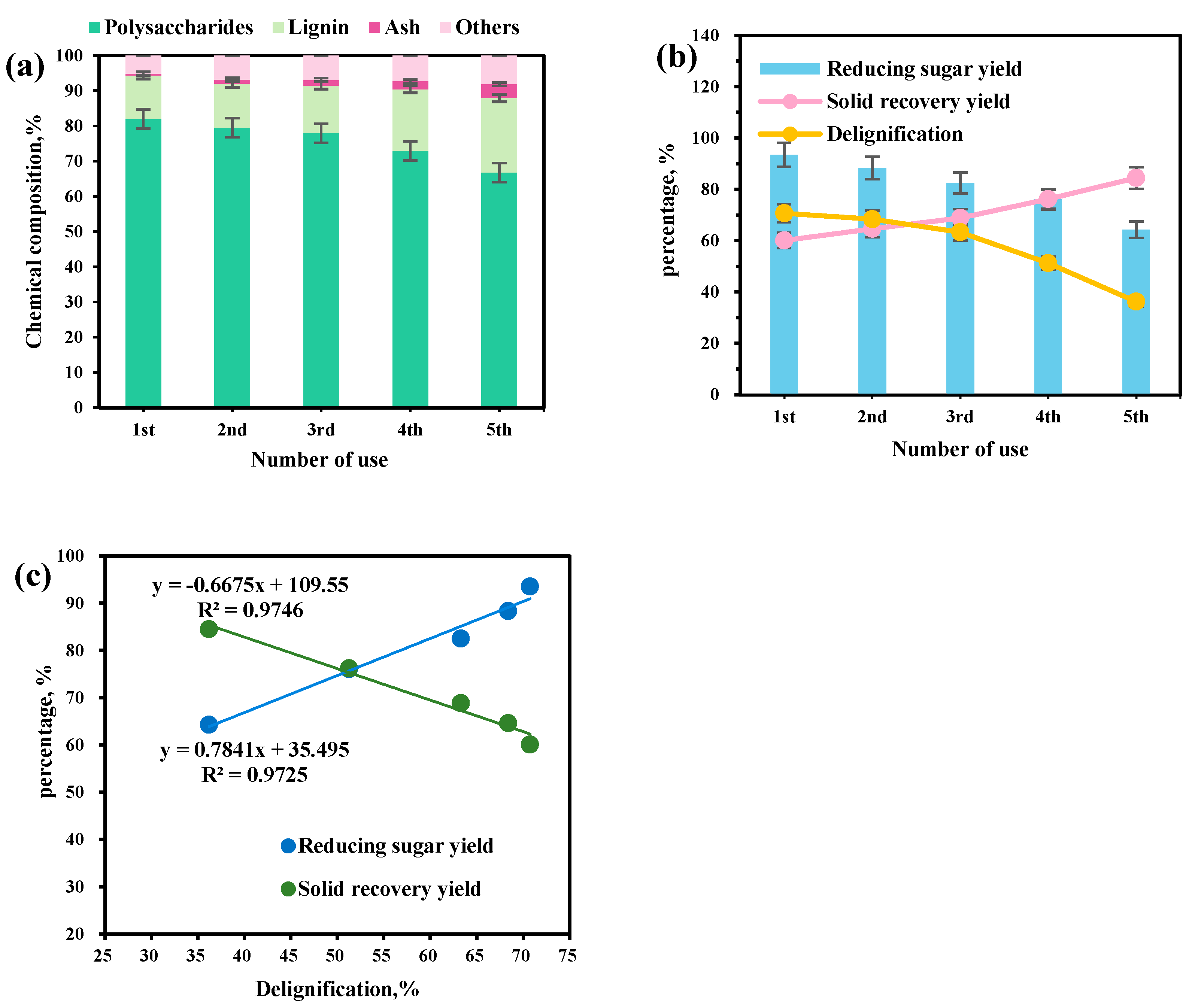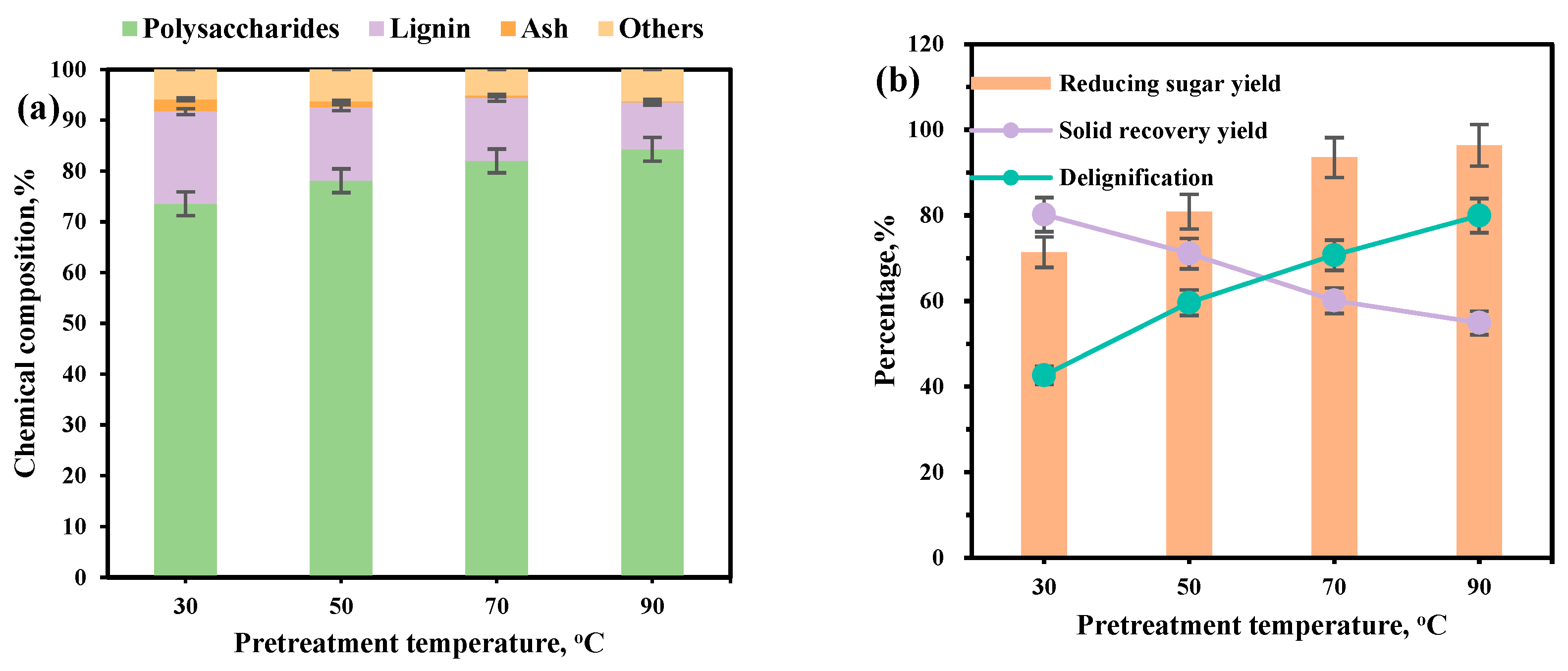 | Sample | Chemical Components (%) | Solid Recovery Yield | Delignification | Reducing Sugar Yield | ||