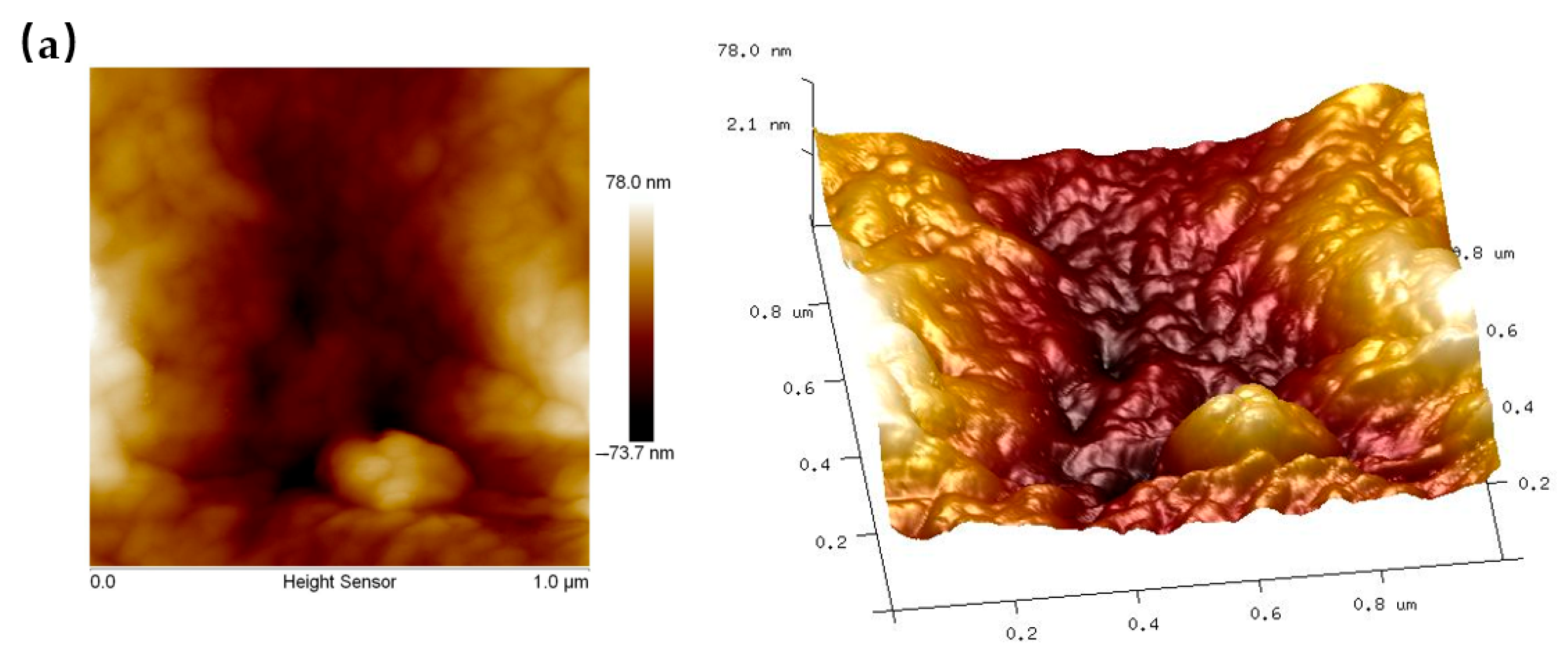 - Mendez-Vilas, A.; Bruque, J.M.; Gonzalez-Martin, M.L. Sensitivity of surface roughness parameters to changes in the density of scanning points in multi-scale AFM studies. application to a biomaterial surface. Ultramicroscopy 2007, 107, 617–625. [Google Scholar] [CrossRef]