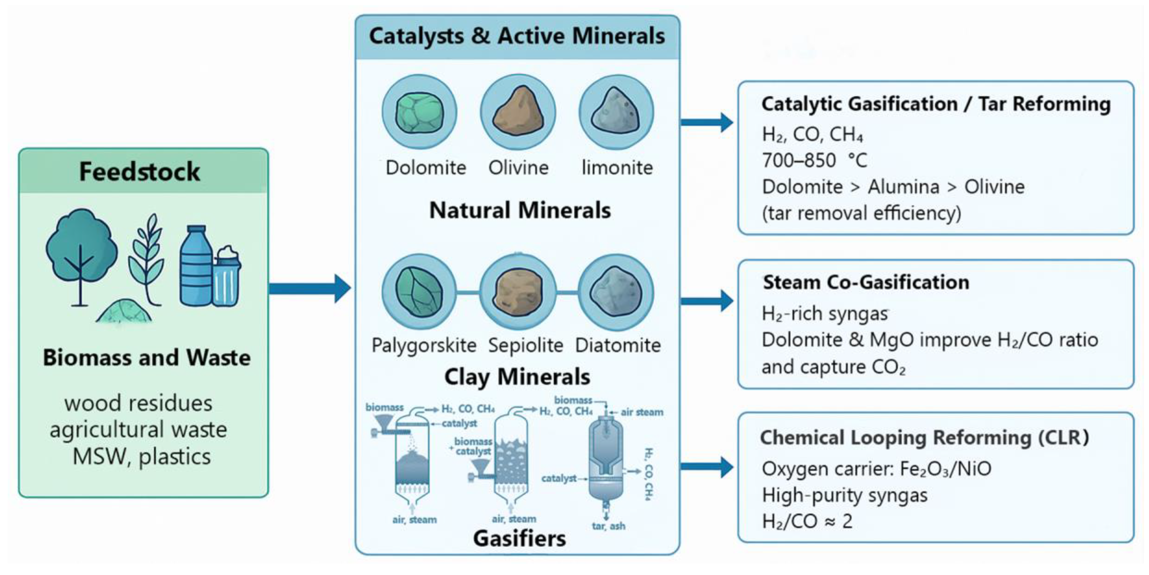 - Alper, D.; Babayiğit, E.; Zengin, G.E.; Okutan, H.C.; Sarıoğlan, A. The catalytic influence of low-cost natural minerals on sewage sludge gasification for hydrogen production. Int. J. Hydrogen Energy 2025, 142, 966–980. [Google Scholar] [CrossRef]
