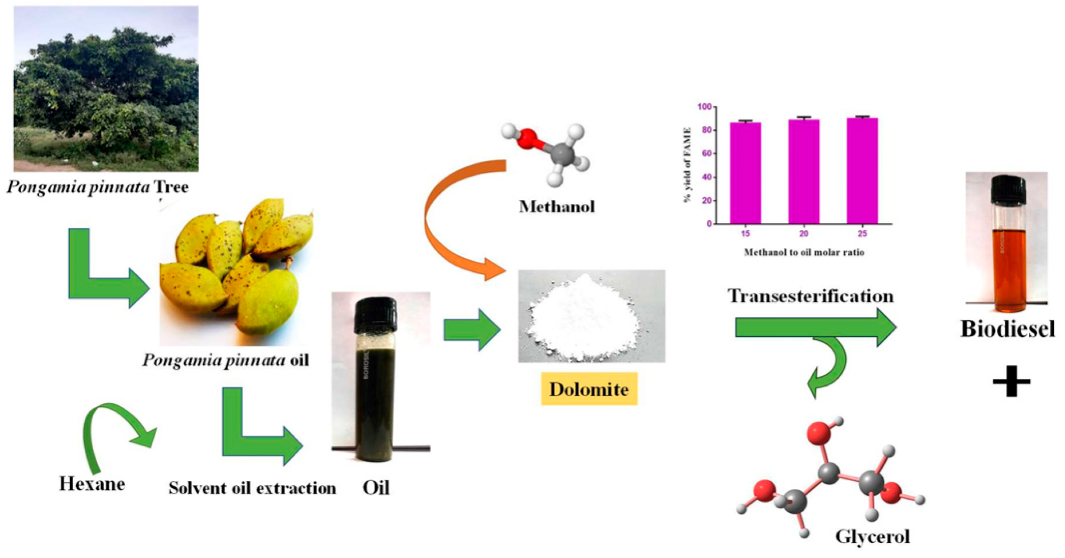 - Sudalai, S.; Devanesan, M.G.; Arumugam, A. Dolomite as A Potential Source of Heterogenous Catalyst for Biodiesel Production from Pongamia pinnata. Nat. Environ. Pollut. Technol. 2024, 23, 2391–2396. [Google Scholar] [CrossRef]
