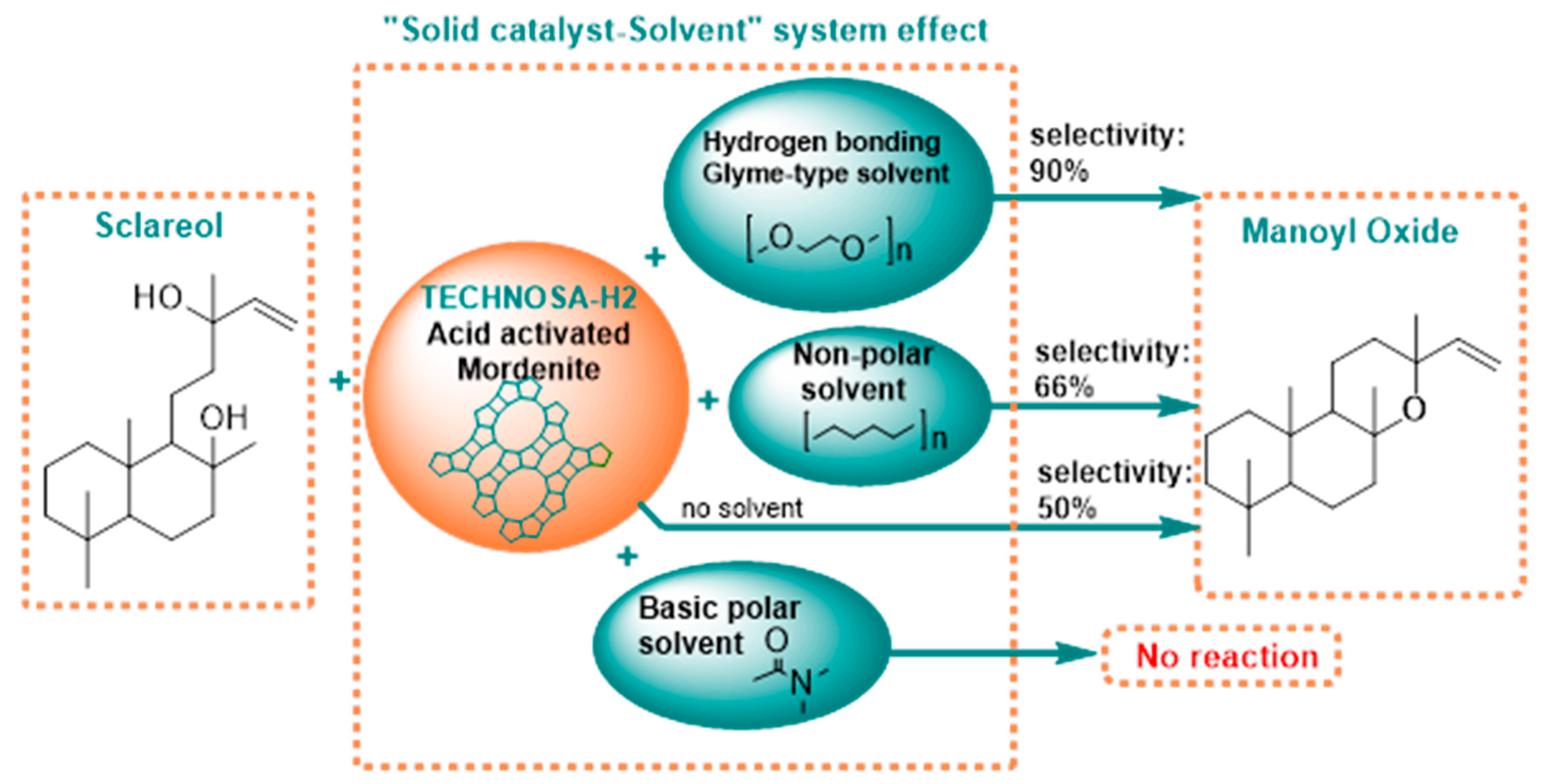 - Makarouni, D.; Kordulis, C.; Dourtoglou, V. Solvent-Driven Selectivity on the One-Step Catalytic Synthesis of Manoyl Oxide Based on a Novel and Sustainable “Zeolite Catalyst–Solvent” System. Catal. Lett. 2022, 152, 1298–1307. [Google Scholar] [CrossRef]