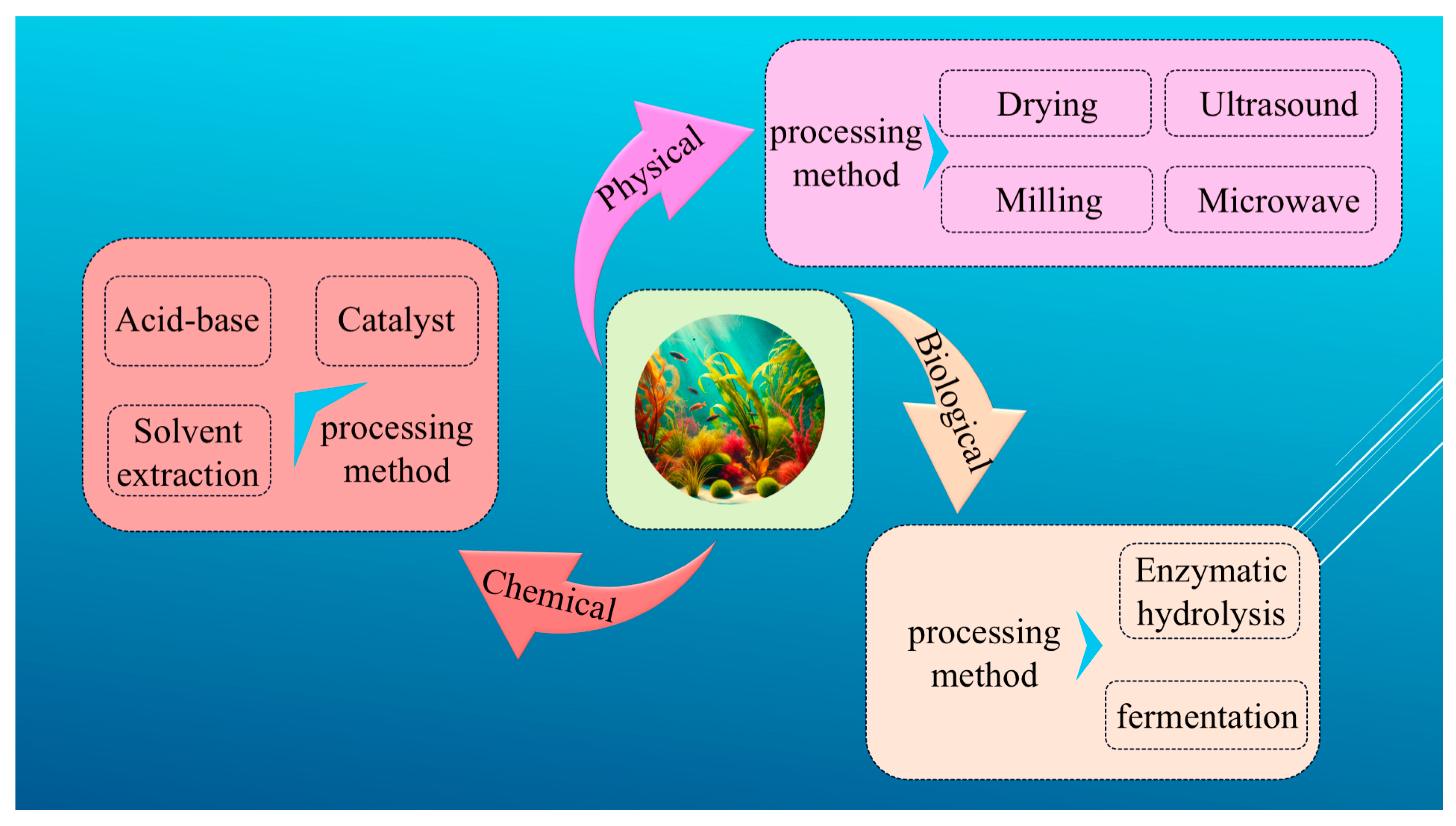 - Maneein, S.; Milledge, J.J.; Nielsen, B.V.; Harvey, P.J. A Review of Seaweed Pre-Treatment Methods for Enhanced Biofuel Production by Anaerobic Digestion or Fermentation. Fermentation 2018, 4, 100. [Google Scholar] [CrossRef]