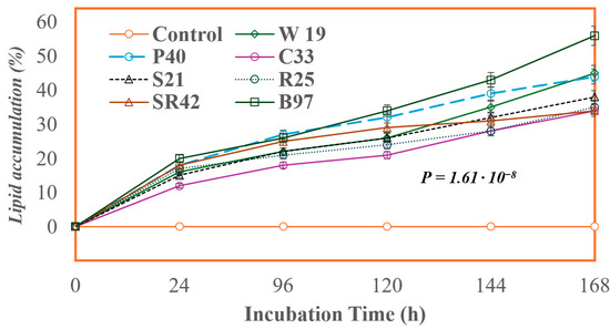 The lipid accumulation potential of the seven isolated fungal strains cultivated on sludge is illustrated in Figure 1, which shows a significant difference (p = 1.61 × 10−8) among all strains. In the case of the control, no lipid accumulation was observed, which revealed that sludge alone does contribute to lipid production in the absence of a fungal strain. B97 showed the highest lipid accumulation of up to 56% after 168 h, confirming its strong oleaginous potential. Following this, strains W19 and P40 also achieved significantly higher lipid accumulation potential (45% and 44%, respectively). The lowest lipid yield was shown by the C33 strain isolated from citrus, which suggested its weak lipid production capacity. These observations are consistent with previous studies, where lipid accumulation by different fungal strains was observed to range from 20 to 80% [38,39]. For instance, the fungal strain M. circinelloides showed a lipid accumulation level of up to 60% using corn steep solids as a feedstock [40]. Similarly, in another study, Mucor circinelloides achieved a lipid accumulation level of up to 43% when cultivated using glucose as a carbon source [41]. Therefore, the high lipid production by B97 (Rhizopus oryzae) underscores its potential as a promising fungus for use in sustainable biofuel generation from sludge.