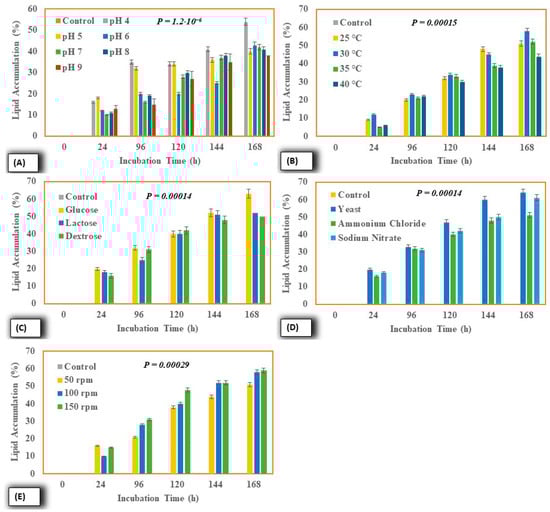 Lipid accumulation potential of Rhizopus oryzae B97; (A) effect of pH, (B) effect of temperature, (C) effect of carbon sources, (D) effect of nitrogen sources, (E) effect of shaking conditions.