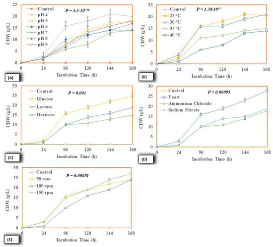 CDW of Rhizopus oryzae B97; (A) effect of pH, (B) effect of temperature, (C) effect of carbon sources, (D) effect of nitrogen sources, (E) effect of shaking conditions.