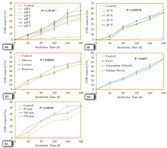 COD removal in sludge using Rhizopus oryzae B97; (A) effect of pH, (B) effect of temperature, (C) effect of carbon sources), (D) effect of nitrogen sources, (E) effect of shaking conditions.