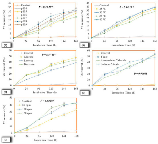Volatile solids removal in sludge using Rhizopus oryzae B97; (A) effect of pH, (B) effect of temperature, (C) effect of carbon sources, (D) effect of nitrogen sources, (E) effect of shaking conditions.