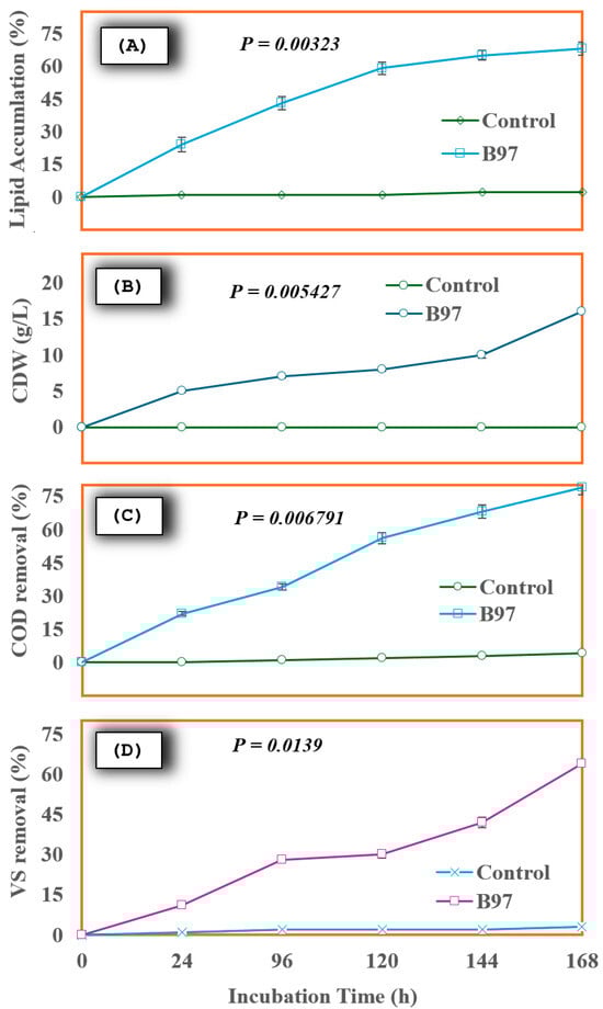 Bioreactor performance using Rhizopus oryzae B97 under optimized conditions: (A) lipid accumulation potential %, (B) cell dry weight, (C) COD removal %, (D) VS removal %.