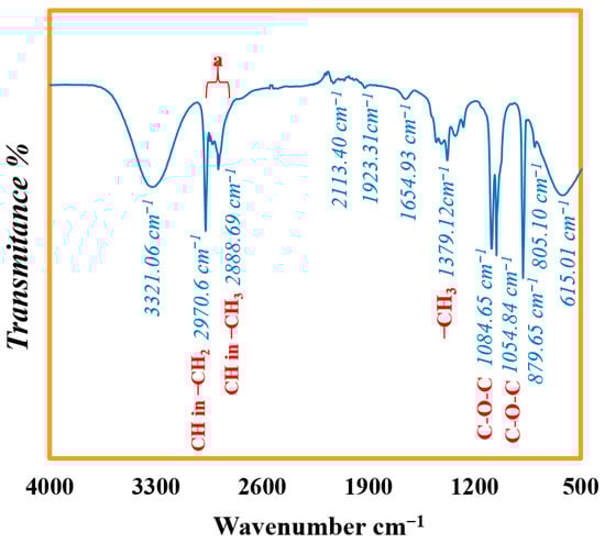 FTIR spectroscopy is a non-destructive method that can be used to analyze the total biochemical profile of both intercellular and extracellular metabolites of fungal cells [53]. The lipid profile of the extracted lipids from the B97 fungal strains was examined using FTIR spectroscopy in the spectral range of 400–4000 cm−1, as illustrated in Figure 7. A set of characteristic peaks were observed for various organic compounds, including lipids, in the spectral regions of 3000–2850 cm−1, 1700–1300 cm−1, 1100–1050 cm−1, and 880–600 cm−1. A close, similar lipid detection range was also reported by Forfang et al. [54]. The lipids can be identified by peaks related to aliphatic C-H stretching vibrations, such as C-H stretching in –CH3 at 2888.69 cm−1, CH2 at 2970.6 cm−1, and C-O-C stretching in esters at 1054.84 cm−1 and 1084.65 cm−1, as lipids typically show aliphatic C-H stretching vibrations. These ranges closely correspond to the reported values of Shurvell [55] and Maquelin et al. [56]. The absorbance values at 1654.93 cm−1 represent the presence of significant amounts of free fatty acids in the extracted fungal lipids. The absorbance peak at 1379.12 cm−1 indicates the –CH3 of acyl chains in fatty acids. These acyl chains could be associated with fatty acids of triacylglycerols (TAGs) [57], which are known as the primary storage lipids of fungal cells. Similarly, the minor peaks at 805.10 cm−1 and 615.01 cm−1 (CH2) are associated with acyl chains in fatty acids of TAGs. The other signals ranging from 2950–2900 cm−1 (a) may be related to glucuronic acid and glycerol.