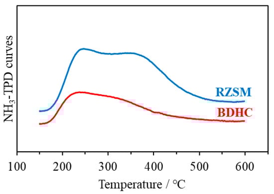 Figure 3 presents the ammonia temperature-programmed desorption (NH3-TPD) curves of the two catalysts. Both catalysts exhibited characteristic peaks at 200 °C and 350 °C, suggesting the existence of weak and strong acid sites. However, BDHC showed smaller characteristic peaks than RZSM, implying that BDHC had fewer total and strong acid sites than RZSM.