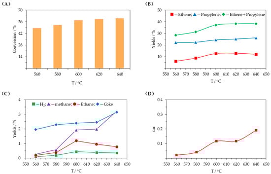 Influence of the reaction temperature (T = 560–640 °C, WHSV = 1.6 h−1, C/O = 25, D = 5). (A) conversion of C4 hydrocarbons; (B) ethene and propylene yields; (C) yields of other products; (D) molar ratio of methane to (ethene + propylene) (mr).