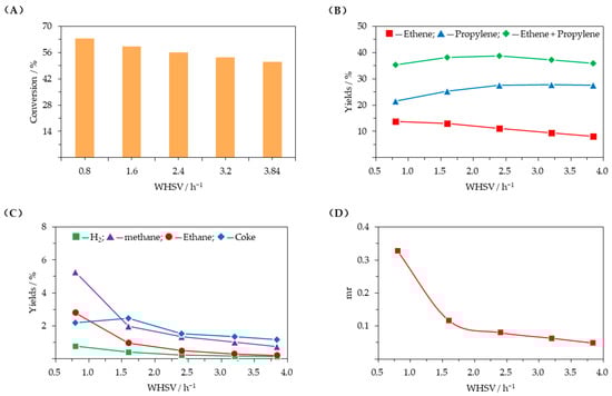 Influence of weight hourly space velocity (T = 620 °C, WHSV = 0.8–3.8 h−1, C/O = 25, D = 5). (A) conversion of C4 hydrocarbons; (B) ethene and propylene yields; (C) yields of other products; (D) molar ratio of methane to (ethene + propylene) (mr).