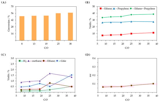 Influence of catalyst–oil mass ratio (T = 620 °C, WHSV = 2.4 h−1, C/O = 5–38, D = 5). (A) conversion of C4 hydrocarbons; (B) ethene and propylene yields; (C) yields of other products; (D) molar ratio of methane to (ethene + propylene) (mr).
