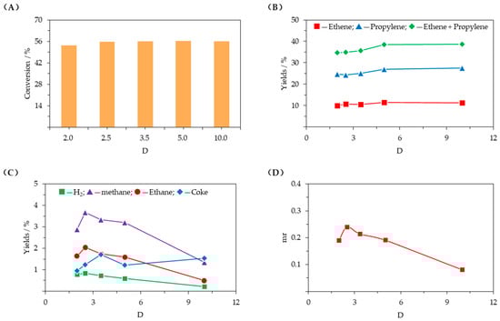 Influence of feedstock volume dilution ratio (T = 620 °C, WHSV = 2.4 h−1, C/O = 25, D = 2–10). (A) conversion of C4 hydrocarbons; (B) ethene and propylene yields; (C) yields of other products; (D) molar ratio of methane to (ethene + propylene) (mr).