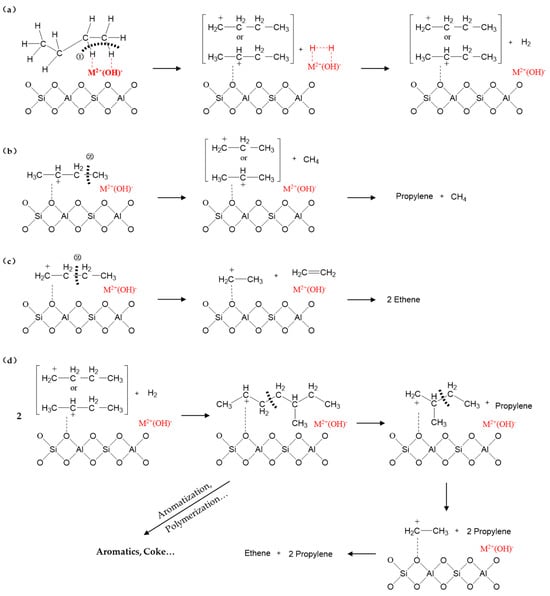 The reaction pathway of the catalytic dehydrogenative cracking of C4 paraffins. (a) Catalytic dehydrogenative cracking of C4 paraffins; (b,c) direct cracking of C4 carbocations; (d) oligomerization–cracking of C4 carbocations.