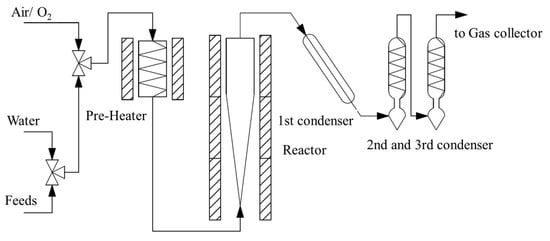 A fixed fluidized bed reactor (FFB) plant was used for the evaluation, which was designed by Sinopec Research Institute of Petroleum Processing Co., Ltd. (Beijing, China) and manufactured by Shanghai Meryer Experimental Equipment Co., Ltd. (Shanghai, China). It consisted of a pre-heater, a reactor, the 1st condenser, the 2nd and 3rd condensers, and a gas collector (Figure 11). Prior to the test, a certain amount of catalyst was loaded into the reactor, and the reactor temperature was increased to a set value while maintaining the catalyst in a fluidized state. The process is as follows: The raw material is preheated and mixed with high-temperature water vapor and then enters the bottom of the fluidized reactor through the feed nozzle to react on the hot catalyst. After the reaction, water vapor enters the reactor for vapor extraction, and the reaction oil and gas enter the multi-stage condensation-and-separation system for separation to obtain gas products and liquid products. At the end of the reaction, the reactor is automatically heated to the regeneration temperature, while oxygen is fed into the reactor to burn the coke on the catalyst, and the regenerated flue gas is measured by an infrared analysis meter to measure the real-time CO2 concentration. The coke yield is calculated according to the flue gas flow integral.