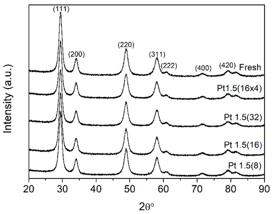 XRD patterns of the fresh 1 wt.% Pt/Ce0.5Zr0.5O2 catalyst compared with those of the ion-bombarded samples. The number of irradiation treatments ranged from 8 cycles for Pt1.5(8) to 64 cumulative cycles for Pt1.5(16 × 4).