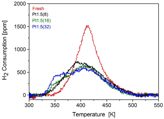 TPR profiles of the fresh 1 wt.% Pt/Ce0.5Zr0.5O2 catalyst compared with those of the ion-bombarded samples, treated with increasing numbers of irradiation cycles ranging from 8 [Pt1.5(8)] to 32 [Pt1.5(32)].