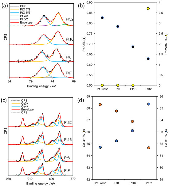 (a) Pt 4f XP spectra, (b) At% of Pt and deconvolution quantification of Pt metal content, (c) Ce 4f XP spectra, and (d) quantification of Ce3+ and Ce4+ in Pt Fresh, Pt8, Pt16, and Pt32 materials.