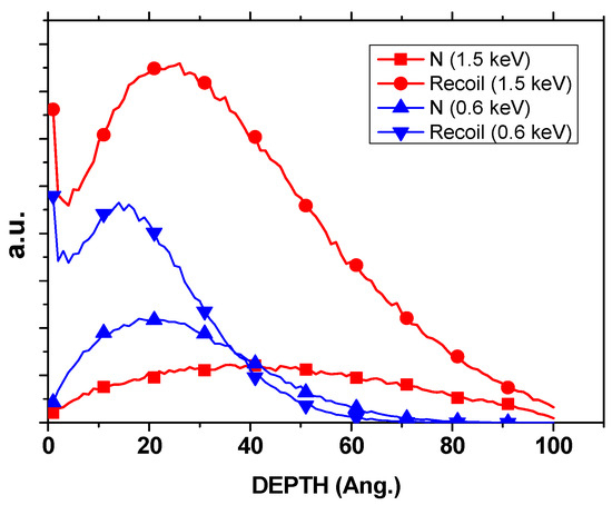 SRIM depth distribution profiles of incident N+ ions and recoiled atoms within a 10 nm Ce0.7Zr0.3O2 layer for two ion energies, 1.5 keV and 0.6 keV.