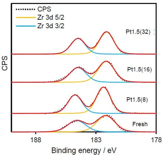 Zr 3d XPS spectra of Pt fresh, Pt8, Pt16, and Pt32 Pt/CeO2–ZrO2 catalysts after ion beam treatment. Red line is the fitted profile of Zr 3d XPS spectra.