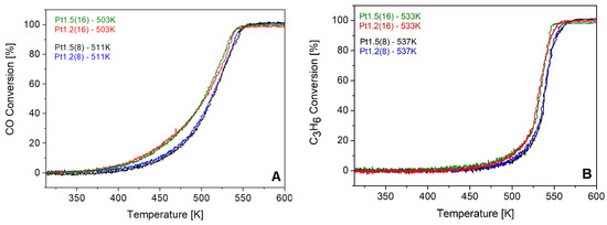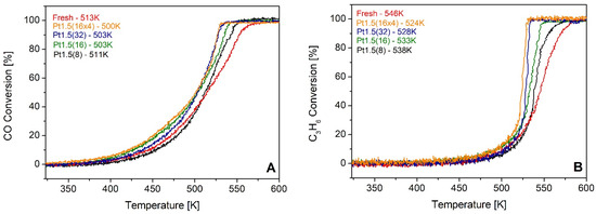 CO (A) and C3H6 (B) light-off curves obtained over a fresh Pt 1 wt.% Ce0.5Zr0.5O2 catalyst compared to those of the samples that had been modified by ion bombardment. The number of treatments given to the samples ranges from 8 (Pt1.5(8)) to 64 (Pt1.5(16 × 4)).