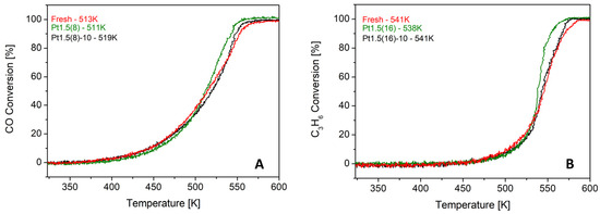 CO (A) and C3H6 (B) light-off curves over fresh Pt 1 wt.% Ce0.5Zr0.5O2 catalyst compared with Pt1.5(16) and Pt1.5(16)-2, which had been exposed to the ion beam for 15 min and 2 min, respectively, during each treatment.