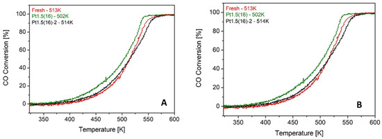 Comparison of light-off curves for samples treated with eight ion beam sputtering cycles at 1.5 keV and a current of 10 mA Pt1.5(8)-10 (A) and the sample treated under the same conditions with 20 mA (Pt1.5(8)) (B).