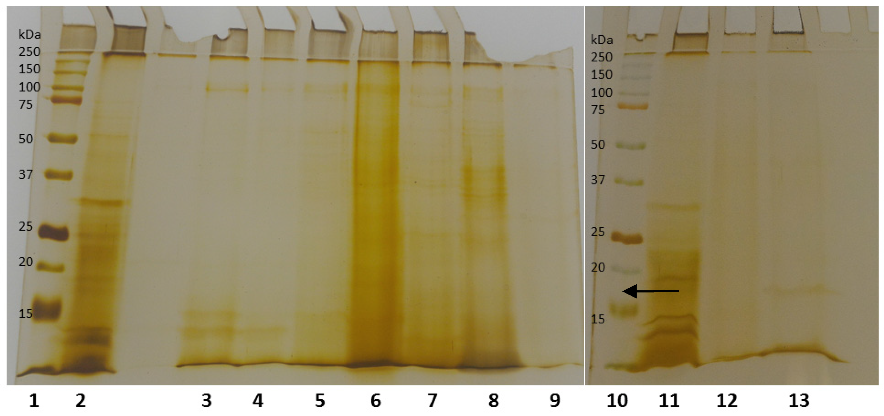 - Laemmli, U.K. Cleavage of structural proteins during the assembly of the head of bacteriophage T4. Nature 1970, 227, 680–685. [Google Scholar] [CrossRef]