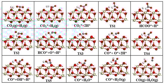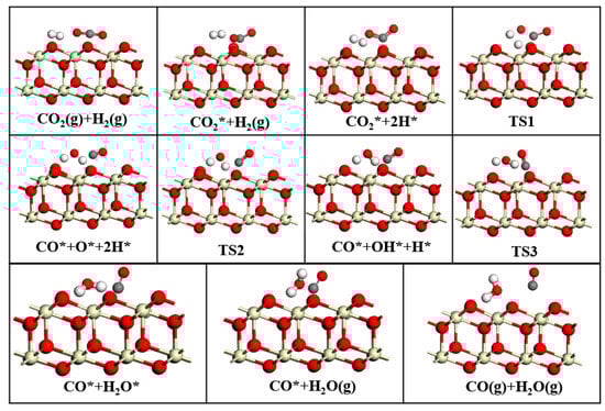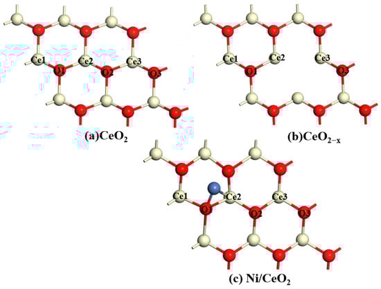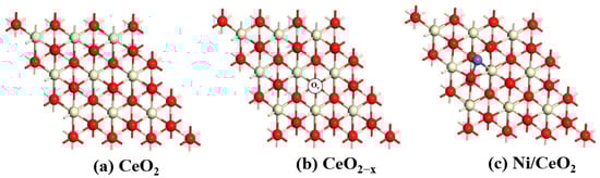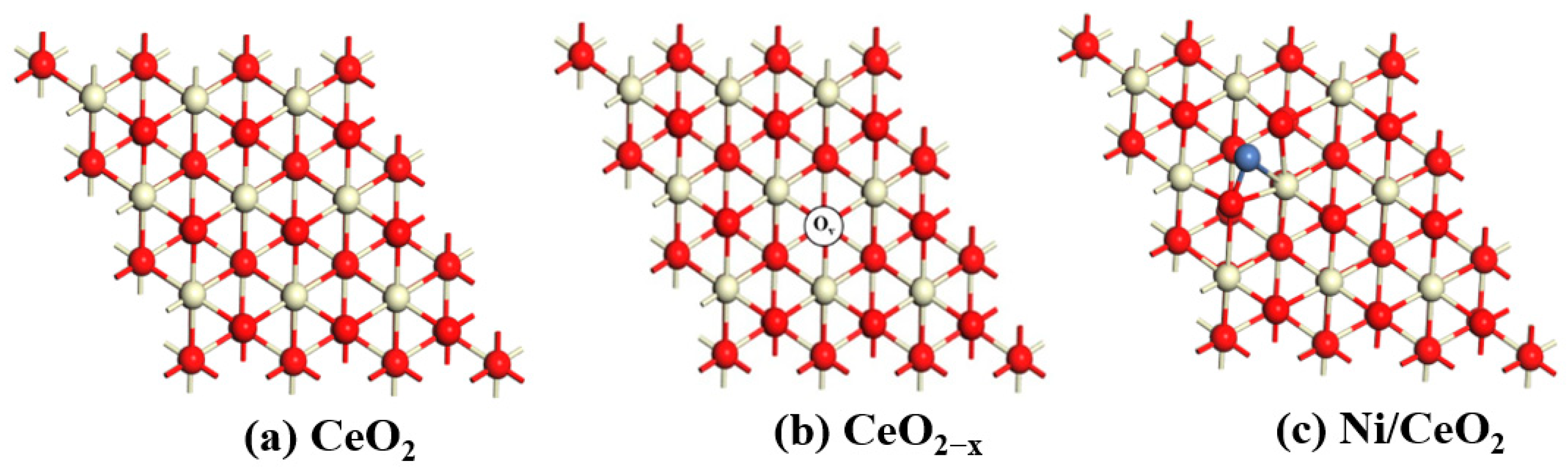 Although this study conducted an in-depth investigation of the RWGS reaction on CeO2, CeO2−x, and Ni/CeO2 using DFT calculations, certain challenges still exist. Traditional DFT methods have obvious limitations when dealing with strongly correlated systems, and they cannot fully account for defect sites commonly present in actual catalytic systems (such as multiple oxygen vacancies and surface hydroxyl groups) as well as dynamic structural evolution processes (such as catalyst surface reconstruction). These limitations may lead to discrepancies between theoretical predictions and experimental results. To address these issues, it is recommended that future research focus on the following directions: constructing a closed-loop research paradigm of computational design–machine learning optimization–experimental validation, integrating theoretical predictions with experimental verification to improve the reliability of catalyst design, and establishing standardized multi-source databases, integrating experimental data (such as catalytic activity and structural characterization) with simulation data (such as DFT-calculated adsorption energies and electronic structures), to facilitate data sharing and cross-validation.