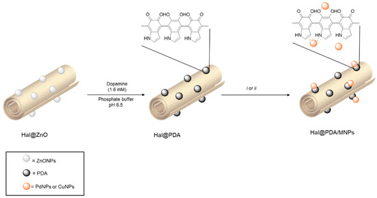 Schematic representation of the synthesis of Hal@PDA/MNP nanomaterials obtained. Step (1) site-specific PDA coating of Hal@ZnO under mild aqueous conditions (pH 6.5). Step (2) separate metal loading routes: (i) Hal@PDA/CuNPs: CuCl2, H2O, 25 °C, 16 h, followed by NaBH4, EtOH, 25 °C, 6 h; (ii) Hal@PDA/PdNPs: PdCl2, NaCl, H2O, 25 °C, 16 h, followed by NaBH4, EtOH, 25 °C, 6 h.