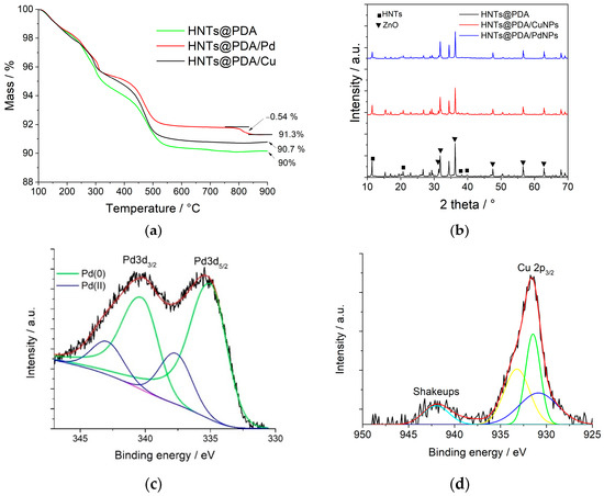 It should be noted that TGA analysis carried out under air flow was shown to be a very useful technique for the exact quantification of the Cu and Pd metal content. In Figure 2a, the TGA curve of the starting Hal@PDA nanomaterial is compared with those of the Cu- and Pd-loaded samples. All curves show the typical mass loss of halloysite due to the removal of differently bonded water molecules, from the surface (100–300 °C) to the interlayer structure at higher temperatures, between ~300 and 500 °C [18]. In the same range of temperature, the decomposition of the PDA polymer likely occurs [17].