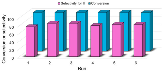 Conversion of (E)-cinnamaldehyde and its selectivity towards hydrocinnamaldehyde (II) after six consecutive runs.