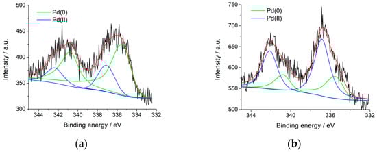 Finally, the catalyst recovered after the first recycling test, and after five consecutive runs, it was subjected to XPS analysis, and the results were compared to those of Hal@PDA/PdNPs (Figure 2c and Figure 6) in order to better understand the catalytic performance. As shown in Figure 6, the amount of Pd(0) slightly decreased after the first catalytic run (from 78% to 75%, Figure 6a), whereas it is strongly oxidized after five consecutive runs, where ca. 36% of Pd(0) was found by XPS analysis (Figure 6b). However, as shown by the catalytic tests (Table 1), the catalyst retains its catalytic activity and selectivity. Very probably, under the reaction conditions, hydrogen pressure can reactivate the catalyst, allowing it to keep its activity practically unchanged.