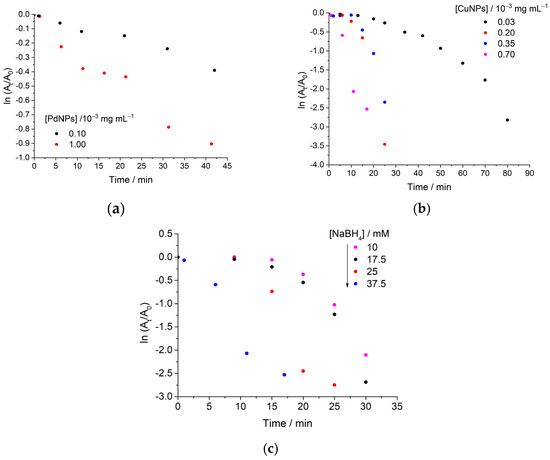 Plots of ln(At/A0) versus time for various (a) Hal@PDA/PdNPs, (b) Hal@PDA/NPs, and (c) NaBH4, in the presence of Hal@PDA/CuNP catalyst concentrations. The concentrations of 4-NP and NaBH4 in (a,b) are 0.050 mM and 25 mM, respectively. The concentrations of 4-NP and Hal@PDA/CuNPs in (c) are 0.050 mM and 0.1 mg mL−1 (corresponding to [CuNPs] = 0.7 × 10−3 mg mL−1), respectively.