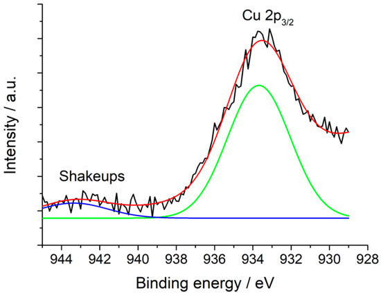 Similarly, the high–resolution Cu 2p spectrum of Hal@PDA/CuNPs (Figure 2d) shows the Cu 2p3/2 peak at ca. 931 eV that is deconvoluted in three main peaks. The peaks with a lower binding energy, at ~931 eV, were assigned to Cu+/Cu0, considering that Cu+ and Cu0 possessed similar peak positions [25]. However, since it is known that the Cu(I) peak is broader compared to that of metallic Cu, it could be hypothesized that the peak centered at 930.87 eV is related to the Cu(I) species, while the one at 931.46 eV is related to Cu(0), respectively.