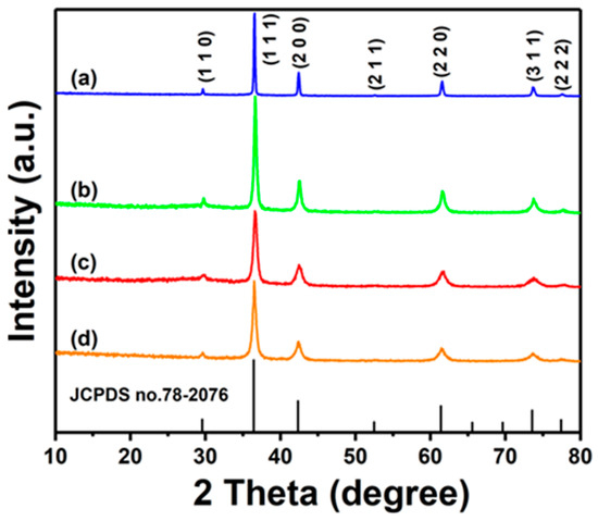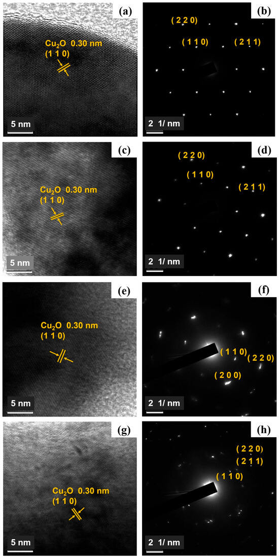 Figure 3a–d display the high-resolution TEM (HRTEM) images, revealing a lattice spacing of 0.30 nm, which corresponds to the (110) crystal plane of Cu2O, in agreement with the XRD pattern (JCPDS no. 78-2076) of cuprous oxide [31]. Selected area electron diffraction (SAED) patterns also confirm the presence of diffraction spots corresponding to the (110), (220), and (211) planes of Cu2O, further supporting the XRD results.