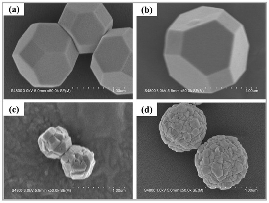 The surface morphology of the photocatalysts was analyzed through FE-SEM. Figure 2a–d displays the FE-SEM images of Cu2O photocatalysts with different Zn doping concentrations. Figure 2a shows that the undoped Cu2O photocatalyst exhibited a truncated octahedral nanostructure with a smooth surface. Figure 2b reveals that Zn-Cu2O-2 retained the truncated octahedral nanostructure after Zn doping. However, as the Zn doping concentration increased, the morphology gradually became distorted. As shown in Figure 2c,d, Zn-Cu2O-6 transformed from a truncated octahedral structure into spherical aggregates composed of irregular nanoparticles, while Zn-Cu2O-20 also exhibited an agglomerated spherical morphology. Additionally, the particle size of Zn-Cu2O-20 was larger than that of Zn-Cu2O-6. Similar observations were reported by Goyal et al. [35], who studied Zn-doped Cu2O for enhanced photocatalytic degradation activity. They found that pure Cu2O particles exhibited a cubic morphology, whereas Zn doping caused the Cu2O particles to transform into distorted spherical shapes with surface defects. The morphological changes observed in this study may be attributed to the effects of Zn doping. The introduction of Zn alters the Gibbs free energy of the system, restricting the mobility of adsorbed atoms. Consequently, the kinetic energy of adsorbed atoms (adatoms) decreases, leading to the formation of agglomerated spherical structures of Zn-doped Cu2O. This mechanism provides a possible explanation for the shape evolution observed in Zn-doped Cu2O in this study.