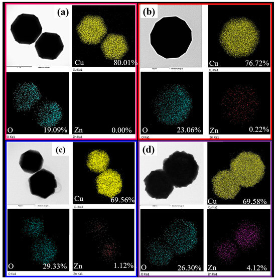 Figure 4 shows the elemental mapping of Cu2O, Zn-Cu2O-2, and Zn-Cu2O-20 photocatalysts. The Cu and O signals originate from Cu2O. Figure 4b–d reveal weak Zn signals, indicating the successful incorporation of Zn dopant into the Zn-Cu2O-2 and Zn-Cu2O-20 photocatalysts. The Zn content of Zn-doped Cu2O samples was monitored by EDS analysis. The Zn contents of Cu2O, Zn-Cu2O-2, Zn-Cu2O-6, Zn-Cu2O-20 photocatalysts are 0, 0.22%, 1.12%, and 4.12%, respectively. The measured Zn content of Zn-doped Cu2O increases with increasing Zn/Cu feeding ratio. The KSP of Cu(OH)2 (2.2 × 10−20) [36] is lower than that of Zn(OH)2 (22.5 × 10−17) [37]. In this study, the measured Zn content of Zn-doped Cu2O is lower than the feed ratio used in the synthesis. Hence, the discrepancy may likely result from limitations in solubility and reaction kinetics. The lower Zn content of Zn-doped Cu2O (compared with the feed ratio used in the synthesis) may be the reason why Zn doping resulted in a decrease in crystallite size without altering the crystal structure, even at a higher Zn/Cu feeding ratio (zinc sulfate/copper(II) sulfate) (Figure 1).