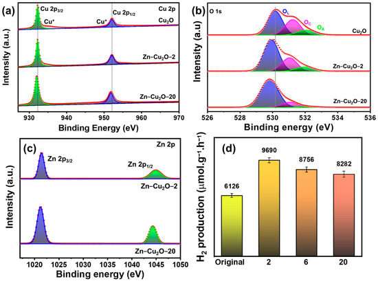 XPS (a) Cu 2p (b) O1s spectra of Cu2O, Zn-Cu2O-2, and Zn-Cu2O-20 (c) Zn 2p spectra of Zn-Cu2O-2 and Zn-Cu2O-20 photocatalysts (d) Hydrogen evolution rates of truncated octahedral Zn-Cu2O-2, Zn-Cu2O-6, Zn-Cu2O-20 photocatalysts.