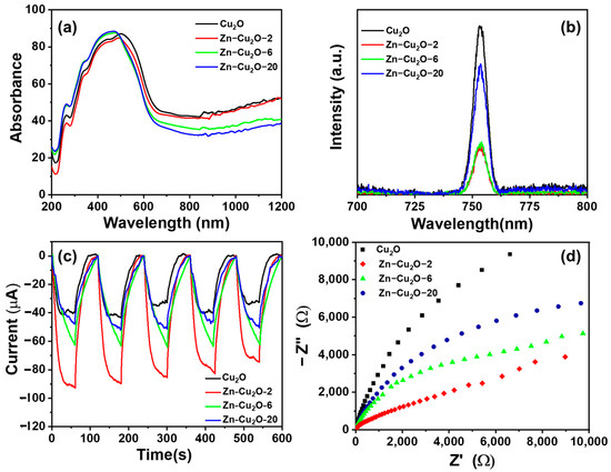 (a) UV-Vis DRS spectra, (b) fluorescence spectra, (c) photocurrent response curves, and (d) Nyquist plots of undoped Cu2O and Zn-doped Cu2O photocatalysts.
