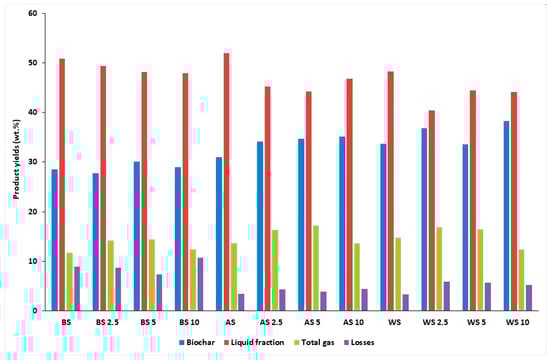 First, the mass balance of the process was determined. (For initial biomass, see Table 1 and Table 2 in Section 2). The results are summarized in Figure 1, which shows that, quantitatively, the main products are bio-oil and biochar. Bio-oils obtained were somewhat moist, which is common for pyrolysis oils. Therefore, this item is marked as the liquid fraction in Figure 1. The yield of total pyrolysis gas was 12–17 wt.%. Since the losses were acceptable, 3–9 wt.%, the mass balance achieved can be used for further considerations. The catalyst appears to promote gas formation to a certain extent, as its addition of 2.5 and 5 g increased the amount of gas from 11.7 to 14.4 wt.% in the case of BS, from 13.6 to 17.2 wt.% in the case of WS, and from 14.7 to 16.8 wt.% in the case of WS. Conversely, in all the cases, a lower yield of bio-oil obtained with the catalyst was recorded compared to the yield without it. The mass balance given is only preliminary because the gas obtained was cleaned with a carbon sorbent to remove carbon dioxide. This changed its density and thus the gas to losses ratio. Gas density can play a role in applications with synthesis gas or hydrogen-rich gas; therefore, attention was paid to the physical properties of cleaned gas (see below).