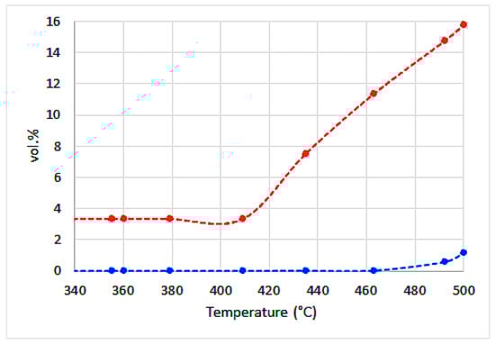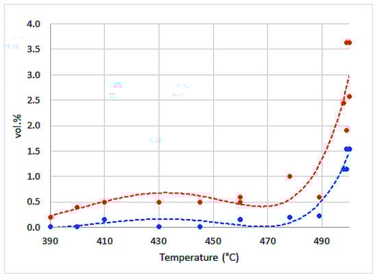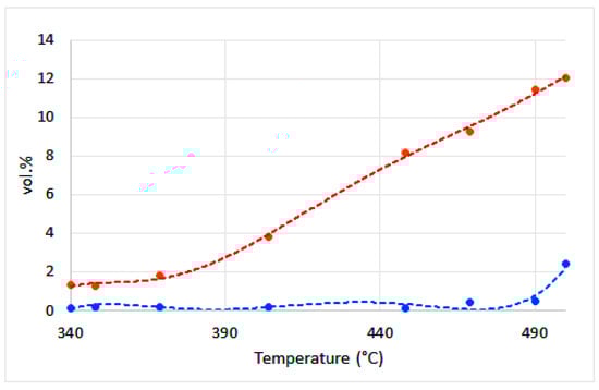 Analysis of obtained gas was carried out on two Agilent (Santa Clara, CA, USA) Technologies 6890N gas chromatographs. Oxygen, nitrogen, and carbon monoxide were determined on a HP-MOLSIV capillary column (40 °C) with helium as the carrier gas (5 cm3 min−1) using TCD, while CH4 and other gas hydrocarbons were determined on a GS-Gaspro capillary column (60 °C) with N2 as the carrier gas (20 cm3 min−1) using FID (air 400 cm3 min−1, H2 30 cm3 min−1, N2 20 cm3 min−1). Carbon dioxide was determined on a GS-Gaspro capillary column (40 °C) with He as the carrier gas (5 cm3 min−1) using TCD. Hydrogen was determined on a HP-5 capillary column (40 °C) with N2 as the carrier gas (7 cm3 min−1) using TCD.
