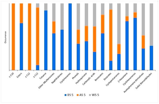 Occurrence of compounds in bio-oils obtained with 5 g Ru/Al2O3 catalyst (loading of Ru is 5 wt.%) from birch wood shavings (BS 5), apricot stones (AS 5), and walnut shells (WS 5).