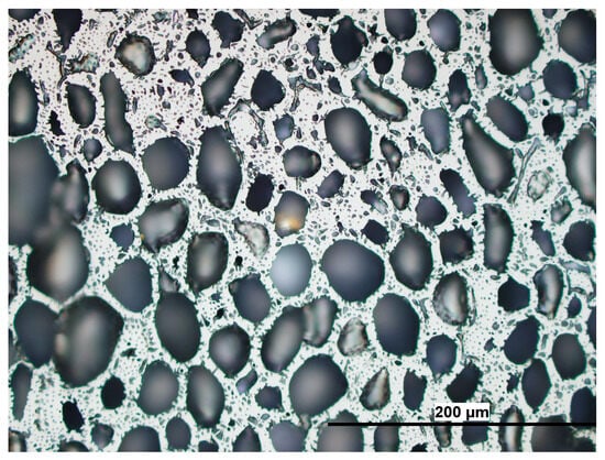 To illustrate the porous texture, two distinct porous textures observed in biochar obtained are pictured: reticulated and with porous walls (Figure 6 and Figure 7). It is highly likely that these two textures determine the porous nature of biochar and thus its sorption predisposition.