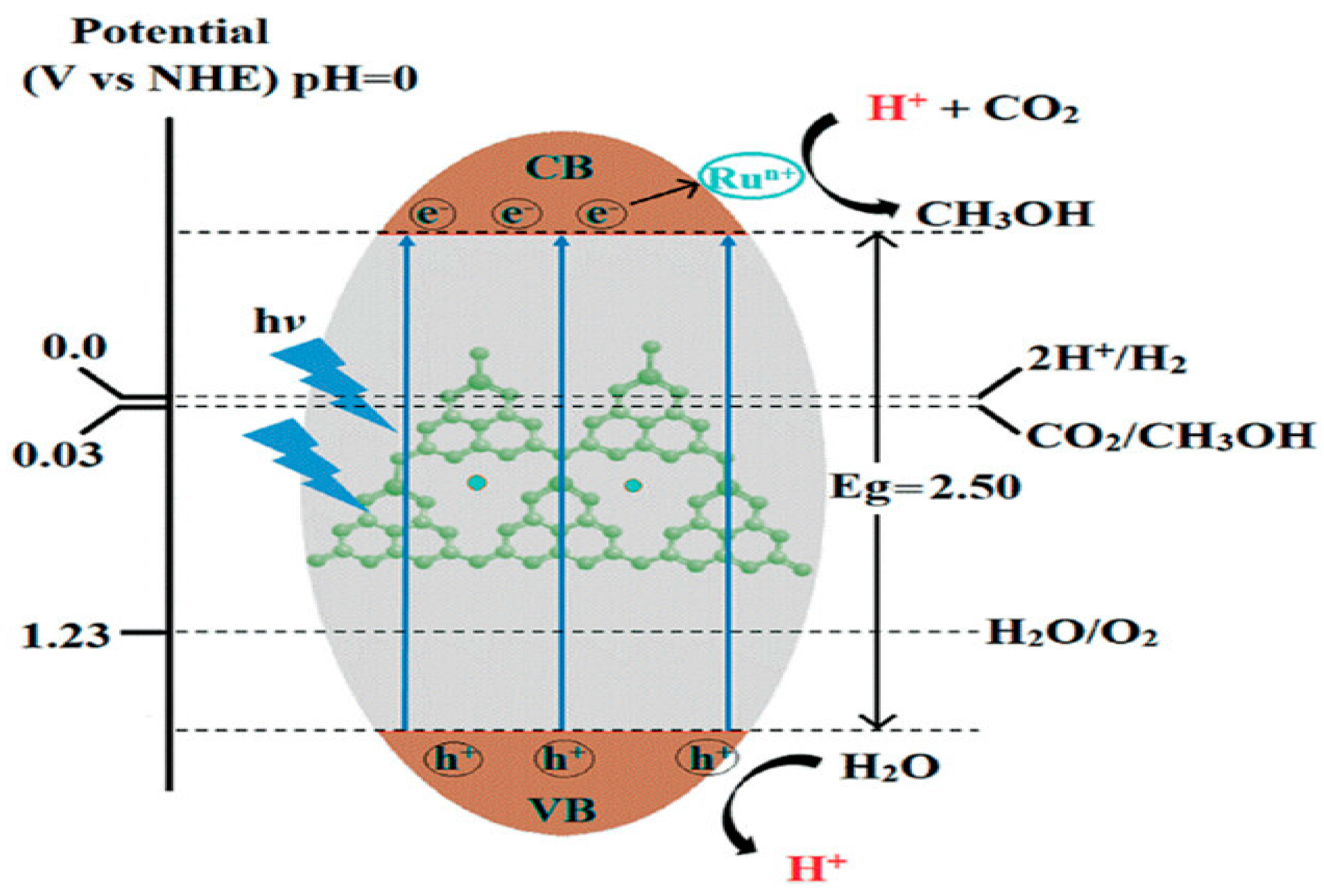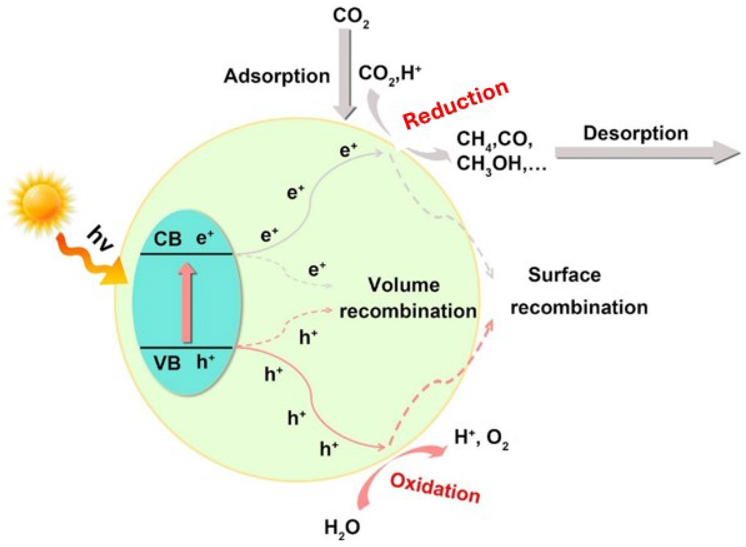 The photoreduction of CO2 is predominantly a surface process that utilizes protons (H+) and photo-generated charge carriers (e/h+) as shown in Figure 1.