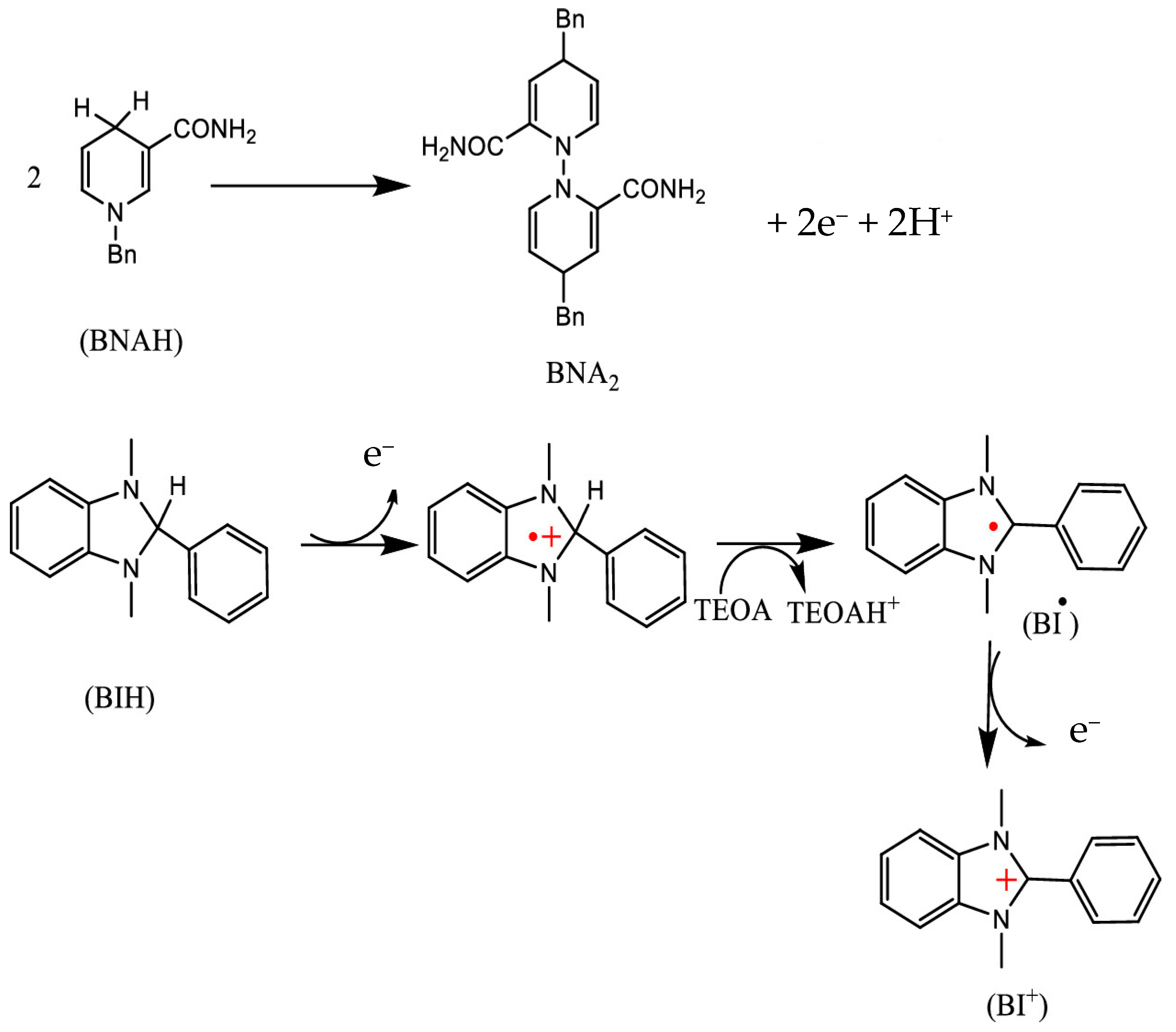 Electron donors release a proton in the oxidized electron donor state (OEOS), which is crucial for suppressing back-electron transfer from the OERS of the PS to the OEOS of the SD [11,14]. Commonly used SDs include aliphatic amines such as triethylamine (TEA) and triethanolamine (TEOA), ascorbate (AscH), and NADH model compounds such as 1-benzyl-1,4-dihydronicotinamide (BNAH) and dihydro-1H-benzo[d]imidazole derivatives (BIH, BI(OH)H). These SDs have often been employed in photochemical CO2 reduction reactions. Figure 3 illustrates the mechanism of sacrificial reduction by BNAH and BIH in the presence of TEOA.