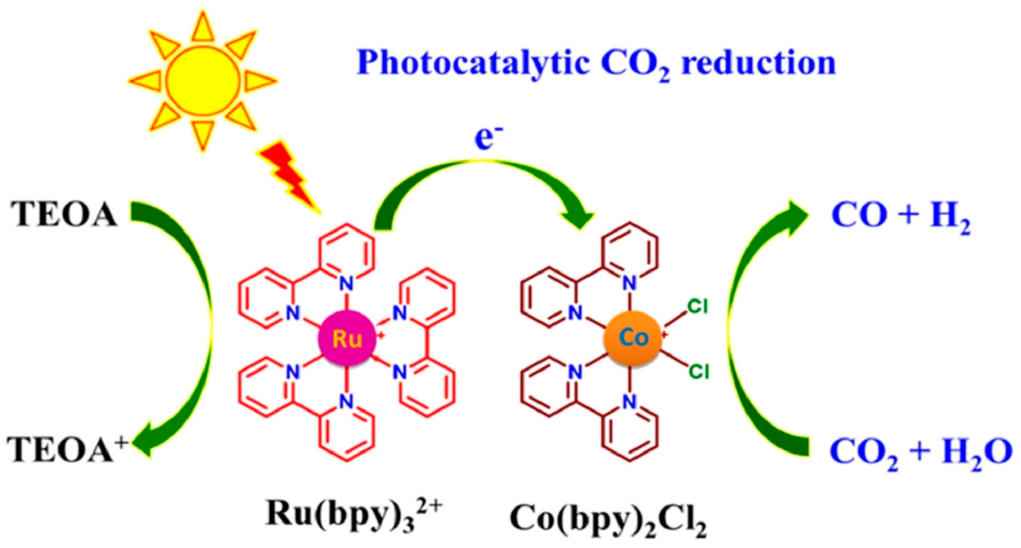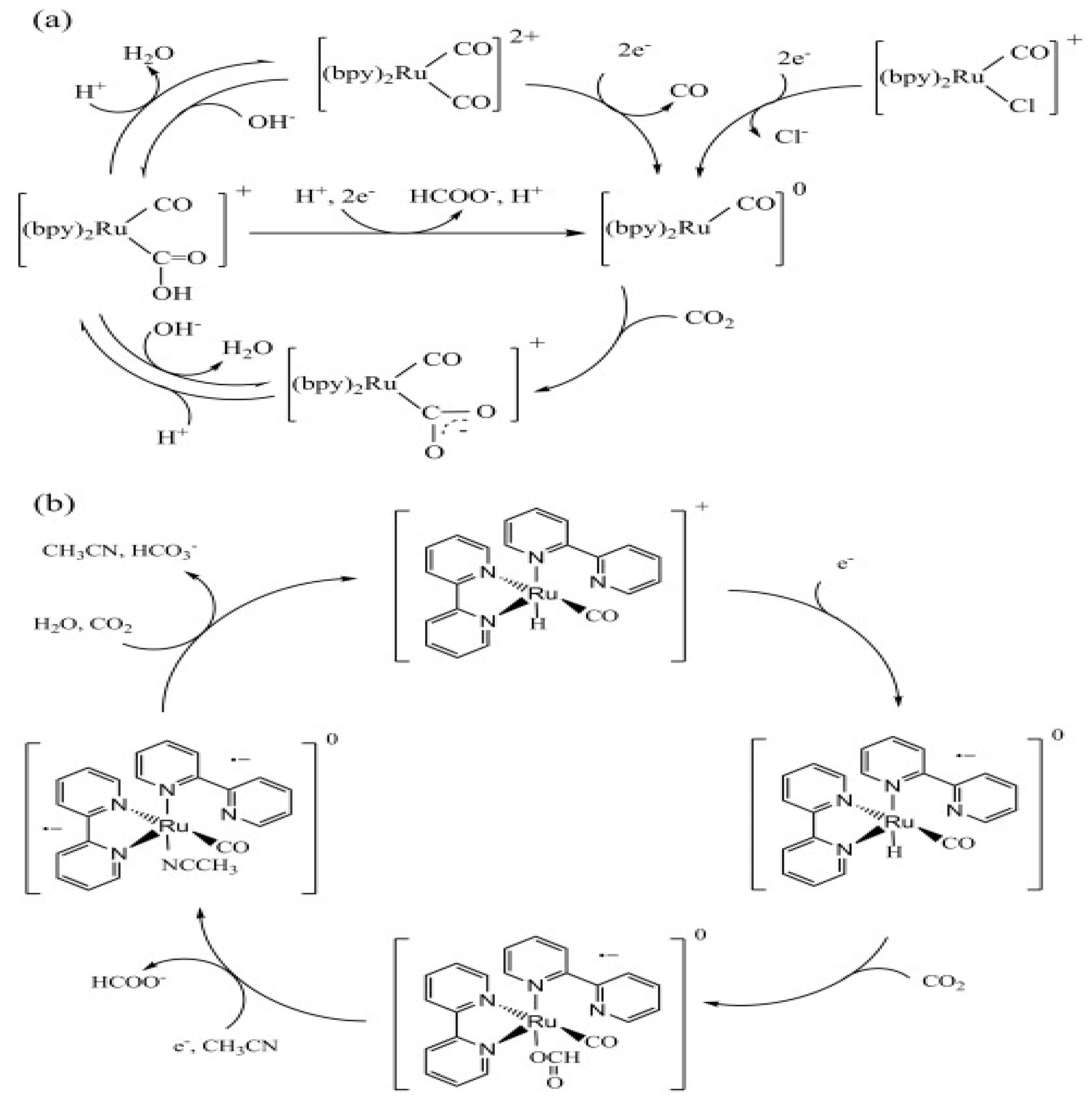 In recent years, [Ru(bpy)2(CO)2]2+ (Ru(CO))-type complexes and their derivatives have been frequently employed as catalysts in CO2 photoreduction. Table 1 displays some of the common Ru(II) complexes used as catalysts in CO2 reduction.