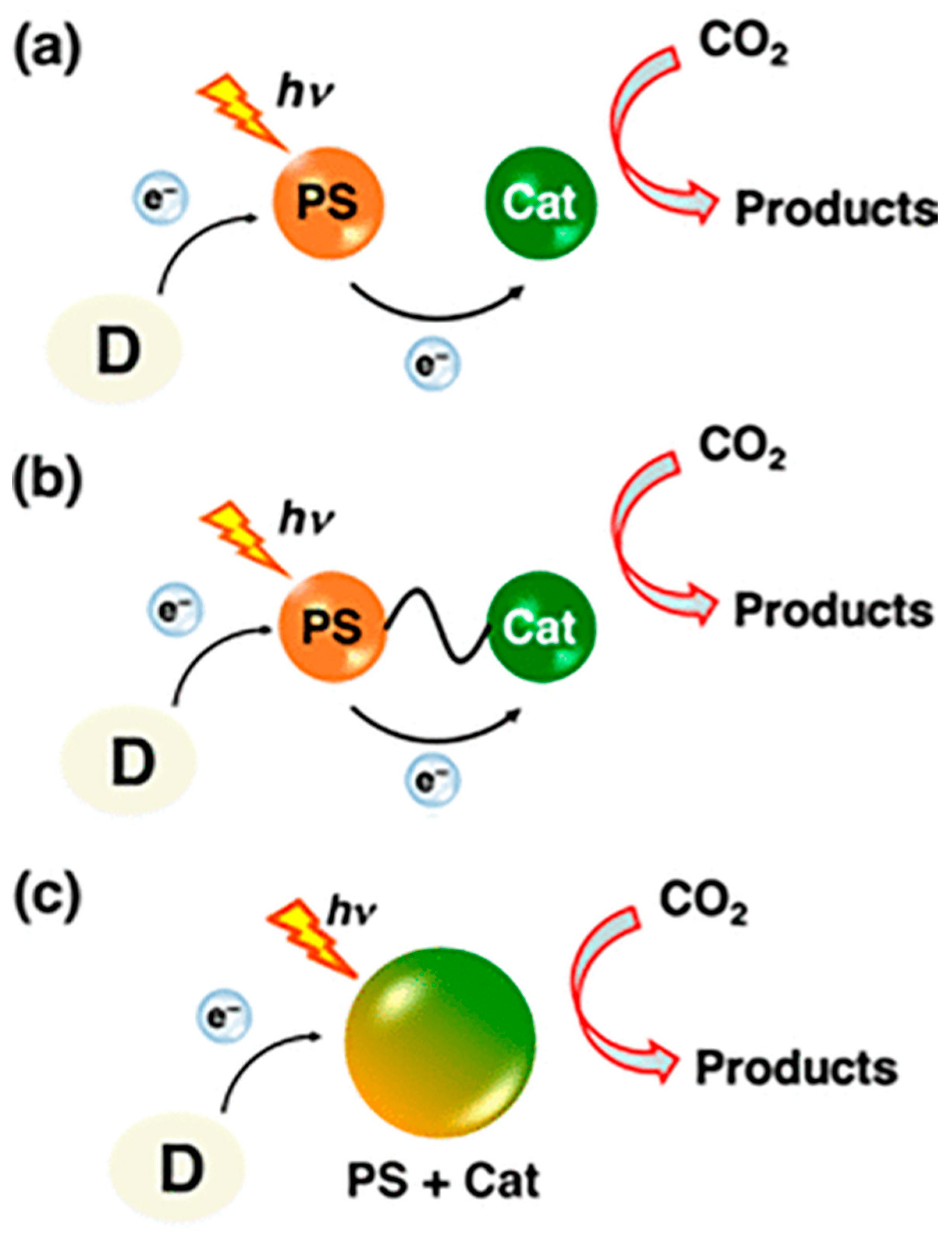 Ru-based photocatalytic systems for CO2 conversion can be divided into three categories: (a) PS/Cat mixed systems, (b) dyad systems, and (c) hybrid or supramolecular catalyst systems, as illustrated in Figure 7.