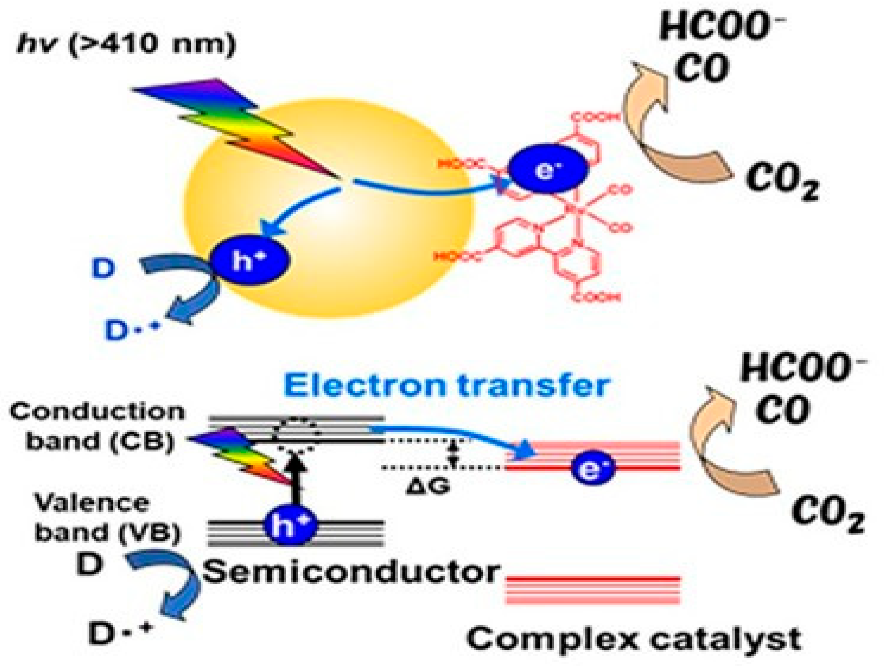 Upon irradiation, the semiconductor generates charge carriers, electrons/holes (e/h+). The photoexcited electrons migrate from the semiconductor CB to the metal complex for selective CO2 reduction at the metal-complex catalyst (Figure 13). The CB electrons drive the CO2 reduction reaction, while the photogenerated holes are neutralized by an electron donor (ED) [62]. Efficient electron transfer requires that the CB minimum of the semiconductor is more negative than the LUMO of the metal complex or its CO2 reduction potential. Additionally, the development of intermediate bands (IB) between the VB and CB under photoirradiation facilitates the redshift frequently seen in Ru-doped semiconductors. These new energy levels have two functions: they facilitate photoactivation during excitation and may also be charge carrier recombination sites [2].